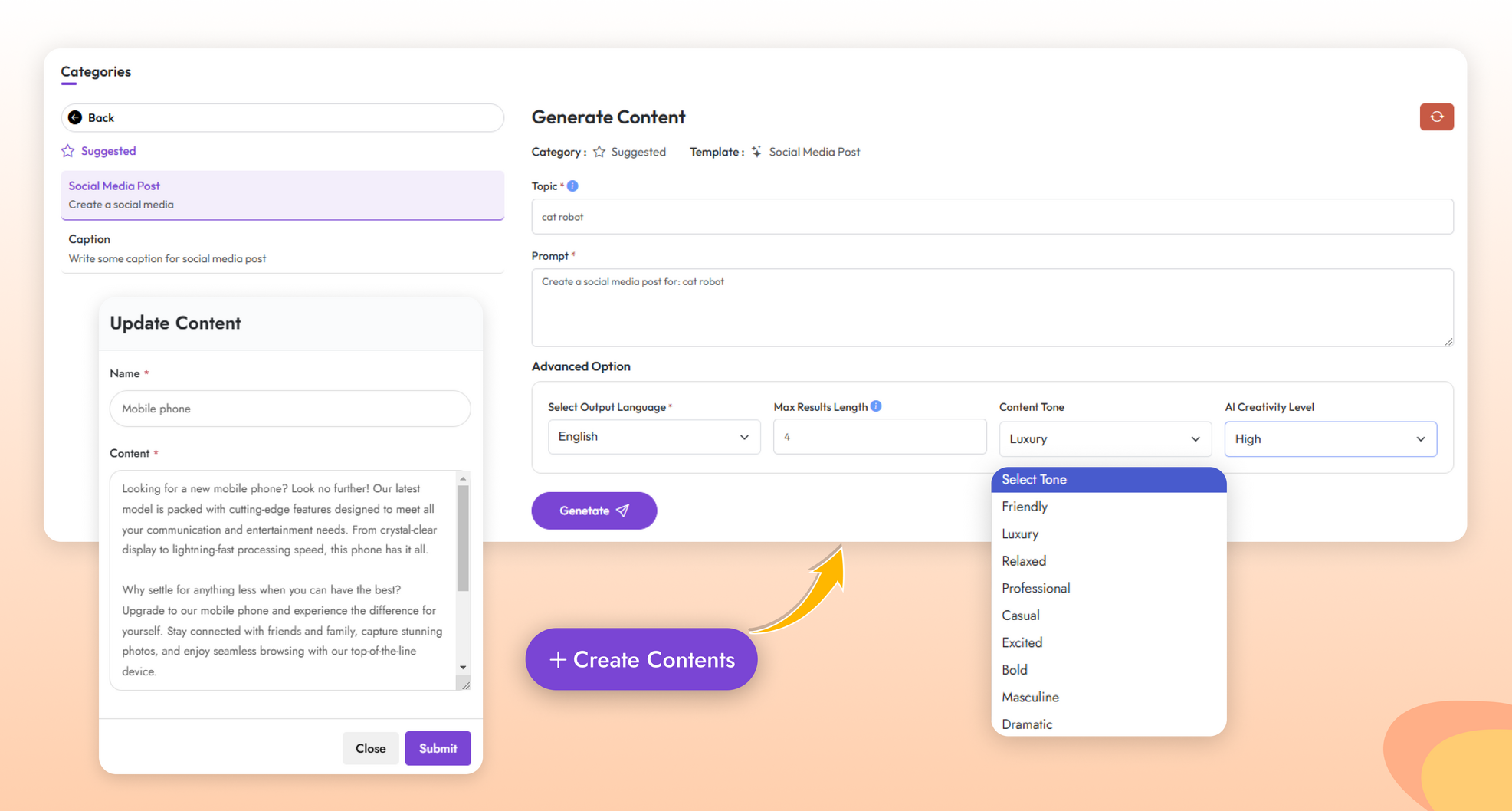 Generate Content: Use AI to craft personalized content, review, and approve before scheduling.
