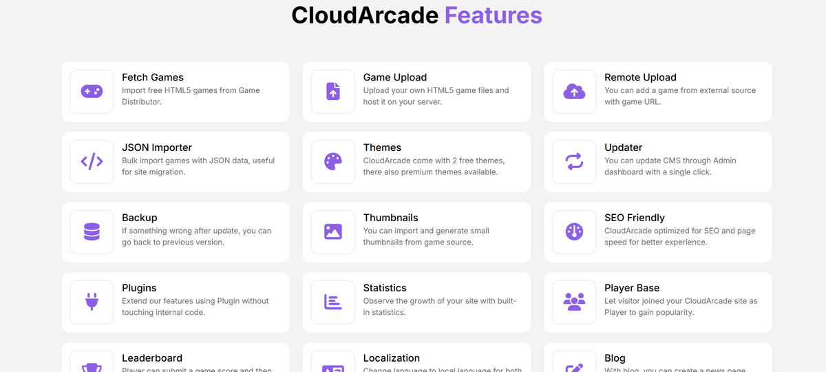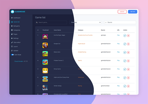 CloudArcade is a lightweight HTML5/Web Game Portal CMS (Content Management System) designed to help you to easily launch and manage your own online gaming website. Whether you want to create a mini-arcade site or a full-blown web gaming platform, CloudArcade provides the tools to do that without any advanced coding knowledge.